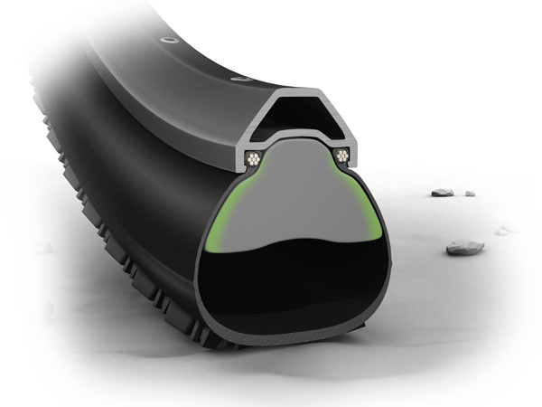 PROTECTION TESTINGCushCore built a drop test tower to measure impact force. The test simulates a rock impact at speed. An accelerometer mounted on the carriage measures the deceleration rate when it impacts the tire (“G-force”). A violent impact delivers a sharp jolt to the rider and increases the danger of rim damage or a flat tire. CushCore reduced impact force by 50% compared to standard tubeless tire.